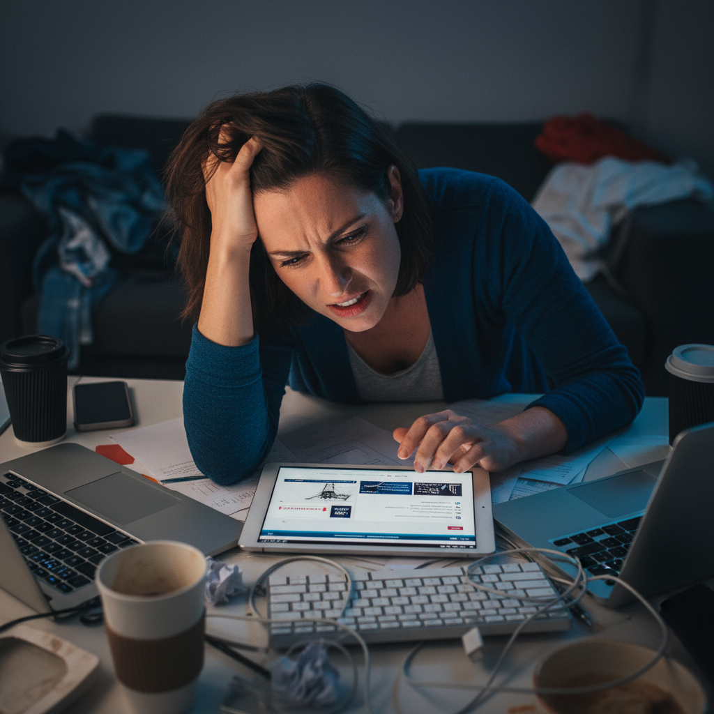 Zdjęcie: Klient rozczarowany jakością usług prawnych online, symbolizujące ukryte zagrożenia.