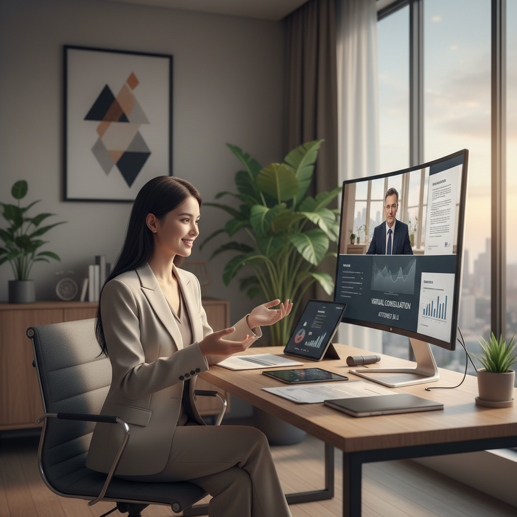 Zdjęcie: Nowoczesny prawnik podczas konsultacji online, podkreślające cyfrową transformację rynku usług prawnych.